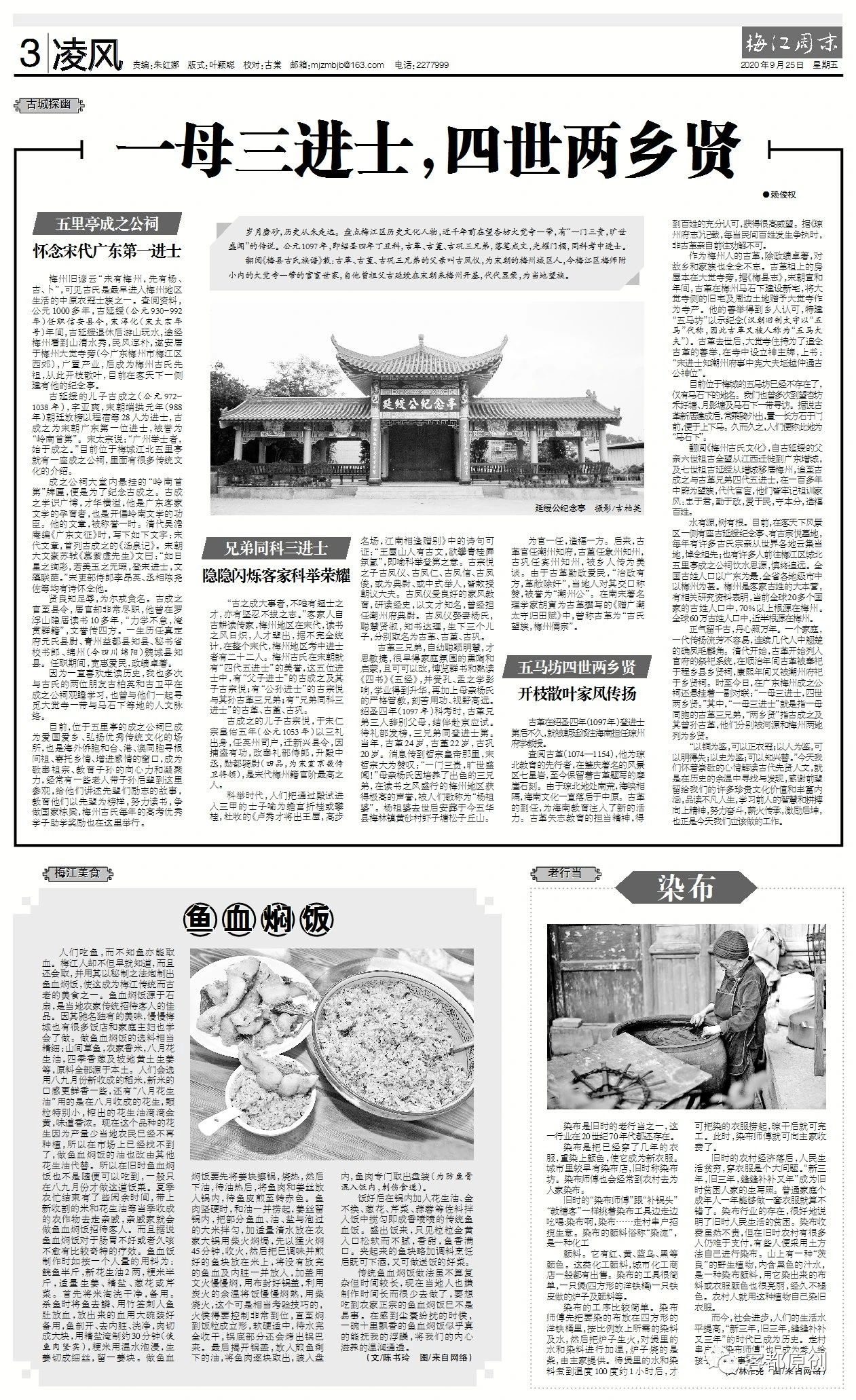 岁月磨砂,历史从未走远。盘点梅江区历史文化人物,近千年前在望杏坊大觉寺一带,有“一门三贵,旷世盛闻”的传说。公元1097年,即绍圣四年丁丑科,古革、古堇、古巩三兄弟,落笔成文,光耀门楣,同科考中进士。翻阅《梅县古氏族谱》载:古革、古堇、古巩三兄弟的父亲叫古凤仪,为宋朝的梅州城区人,今梅江区梅师附小内的大觉寺一带的官宦世家,自他曾祖父古延绶在宋朝来梅州开基,代代显荣,为当地望族。