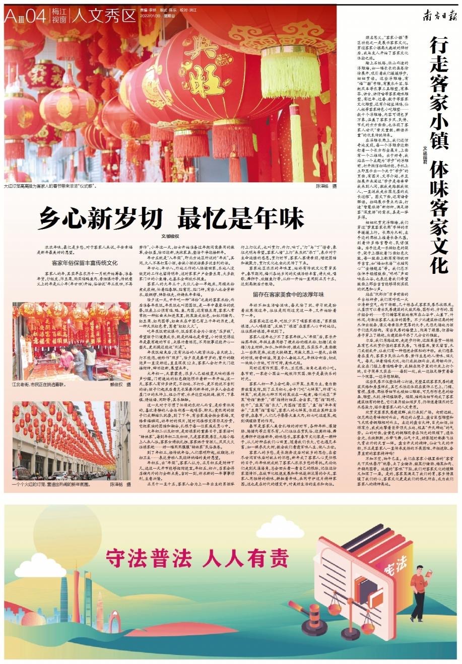 春节是客家人美食扎堆的好时节,各种年料、灌腊肠、腌腊肉等应有尽有,人们往往在赏民俗、迎宾祈福、舞龙舞狮中迎接新年,韵味悠长。客家春节文化也像是一颗种子,从儿时种在我们心田里,随着我们长大,如一棵参天大树,教会我们看透百味人生,教会我们做人立世。
