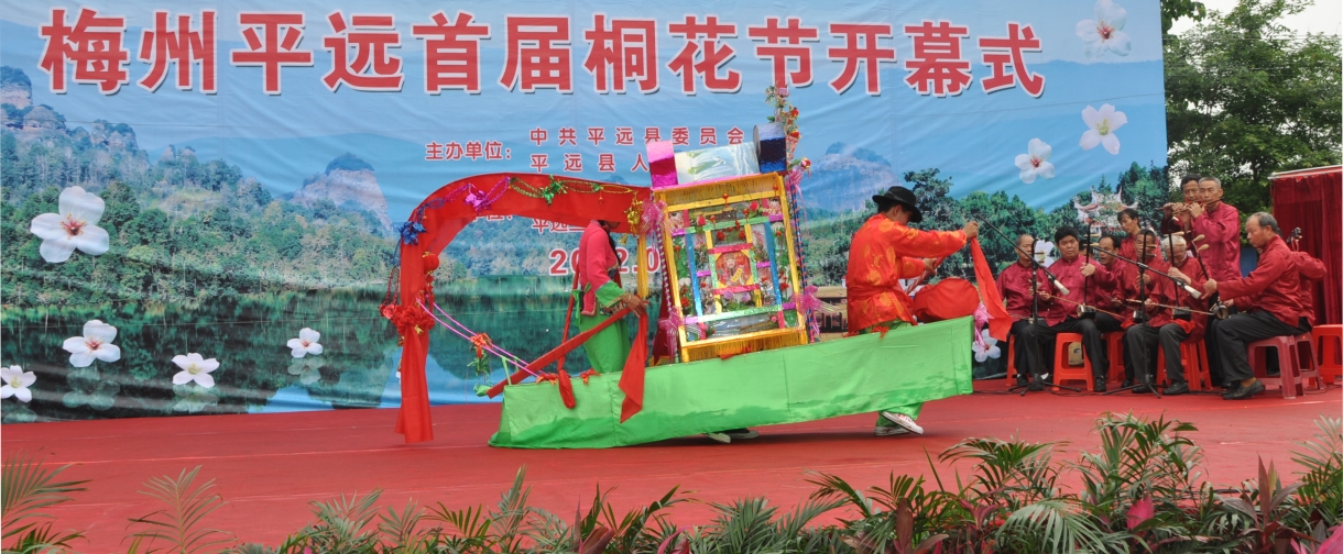平远船灯是广东省梅州市平远县一张亮丽的文化名片,在客家地区乃至广东省内外都有一定的知名度。平远船灯的由来有一个动人的传说:清帝乔装出巡江南,至福建沿海,突遇风暴,险些丧生,幸投宿于一渔船,船家祖父和孙女与其言谈之中,帝获悉渔家饱受渔霸欺凌,不得温饱,甚为恻隐。翌晨临别时,特赠夜明珠一颗,亲笔题赠“渔家乐”金匾和“圣旨”金牌各一。渔翁顿觉福从天降,惊喜交集,叩头跪接。尔后,渔民们再不受渔霸欺凌,且有夜明珠之光,风雨黑夜,均可出海捕鱼,后人便根据这一传说排演船灯。