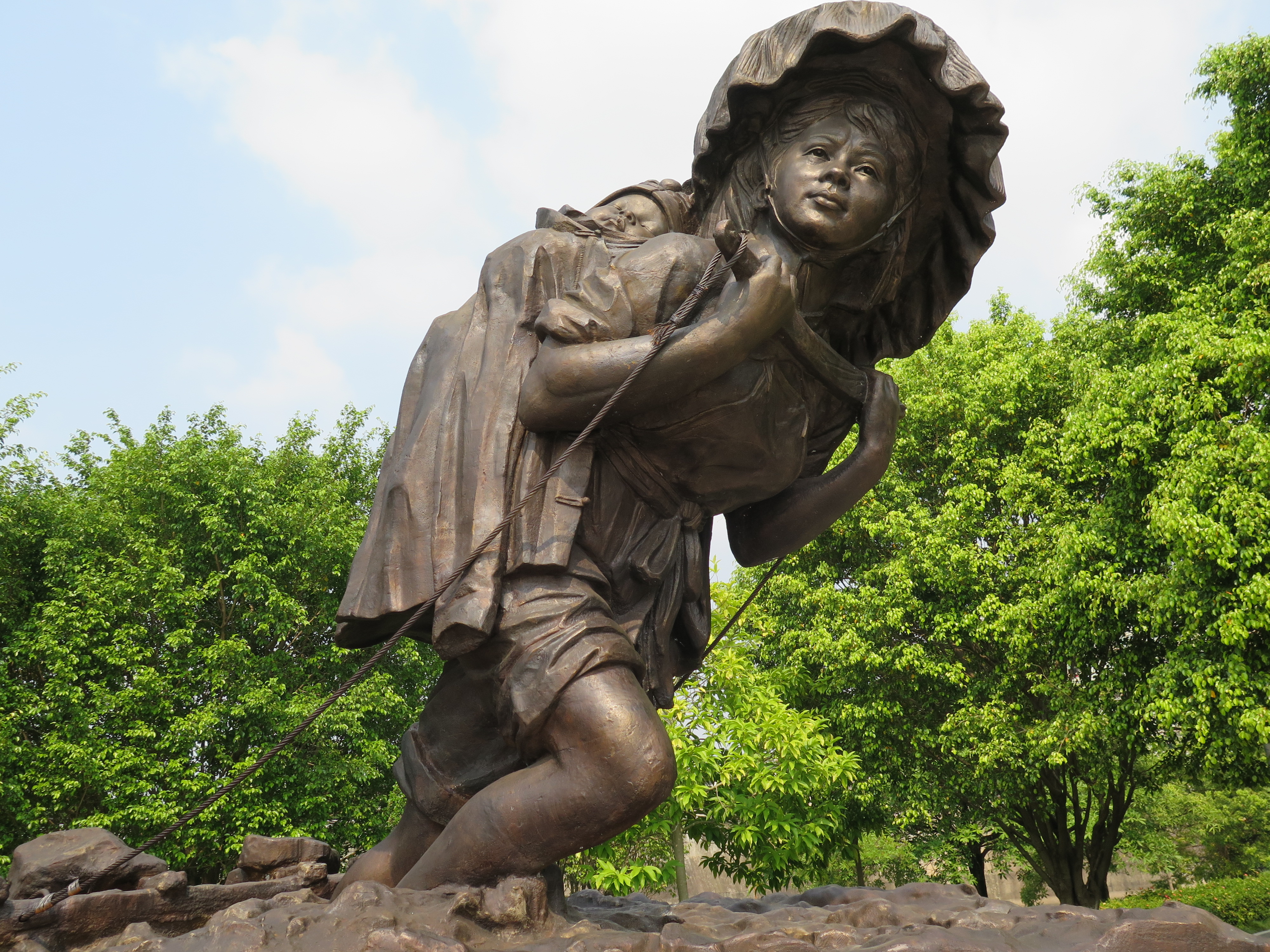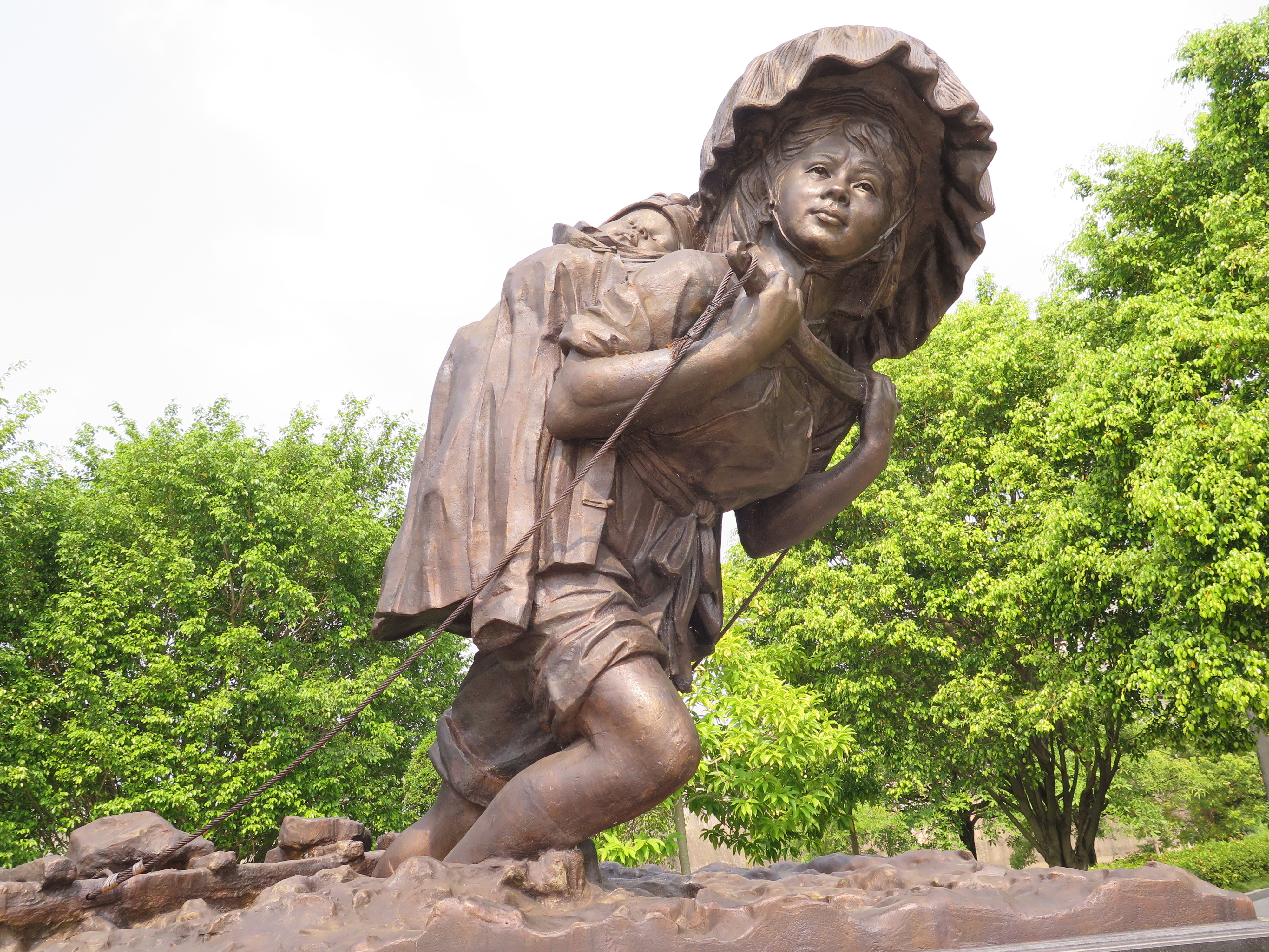 雕塑描述了春耕时节,一名孩童熟睡在年轻的客家母亲背上,母亲以人代牛,倾力行的苦耕形象,这一形象既体现了客家母亲背负着“四头四尾”的艰苦重担,又讴歌了这一群体“敢负人间苦难”的奋斗精神。