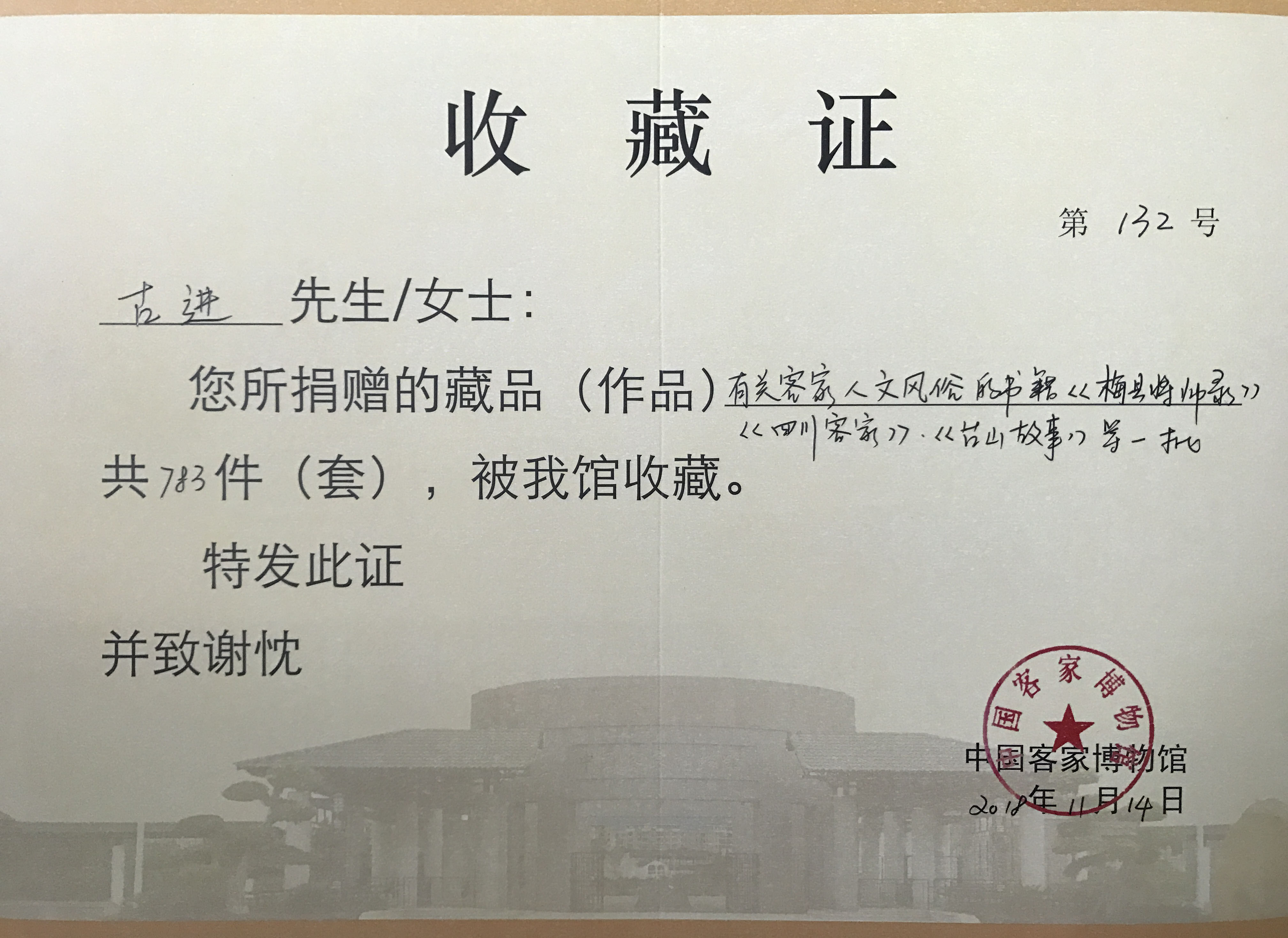 为感谢古进先生对客家文博事业的大力支持,中国客家博物馆向古进先生颁发了《收藏证》,以表我们对古进先生崇高的敬意和衷心的感谢!