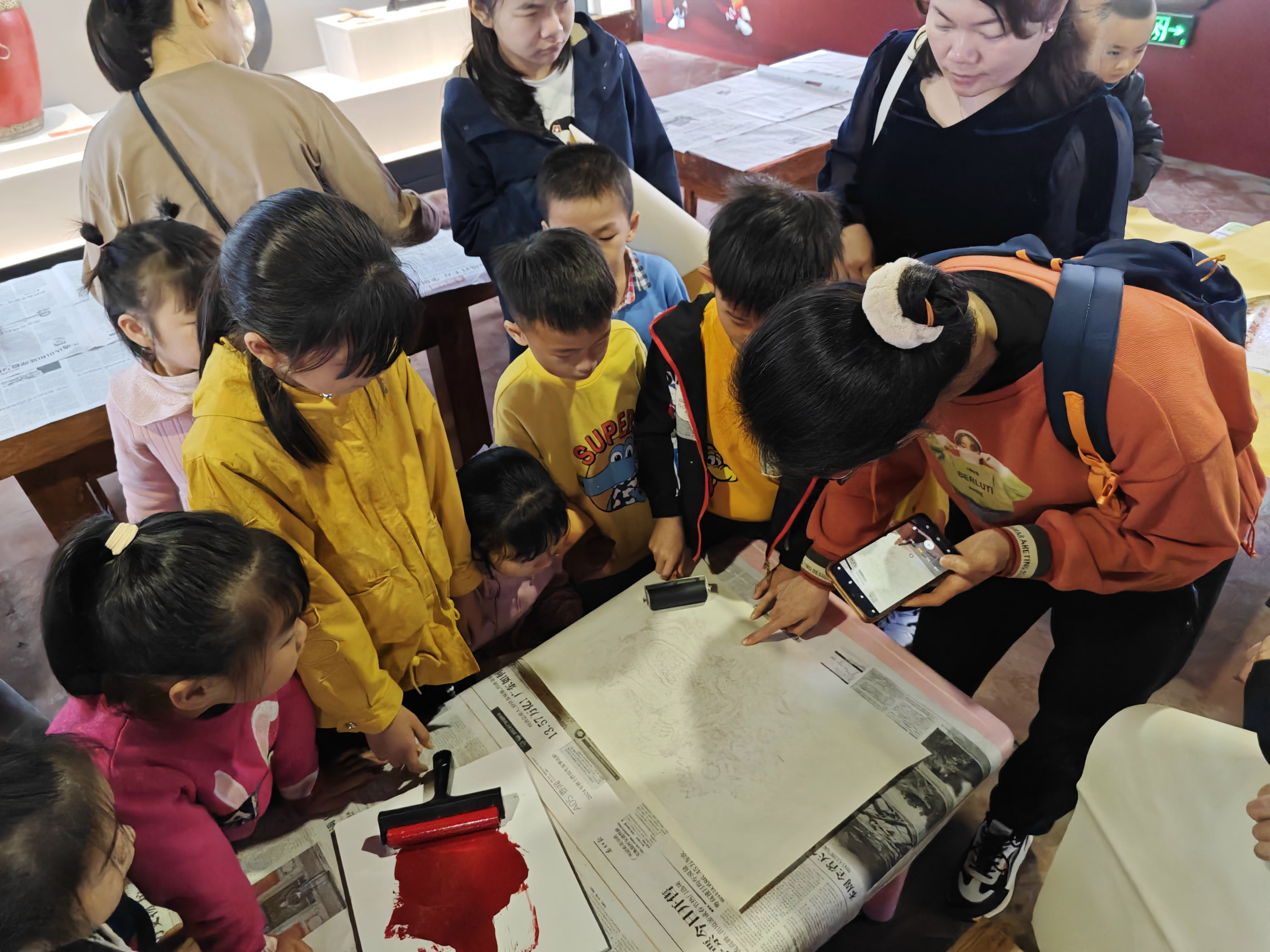 活动邀请梅县区客家门神画区级传承人徐建文为大家授课,介绍客家门神画的相关知识和拓印步骤。在工作人员的指导下,大家用滚轮蘸取颜料,均匀地刷在已经雕出门神图案的木板上,覆盖宣纸,再用工具按压上色,颜料均匀渗透在纸上后轻轻揭起,一幅幅色彩鲜艳的门神画就呈现在大家眼前。
