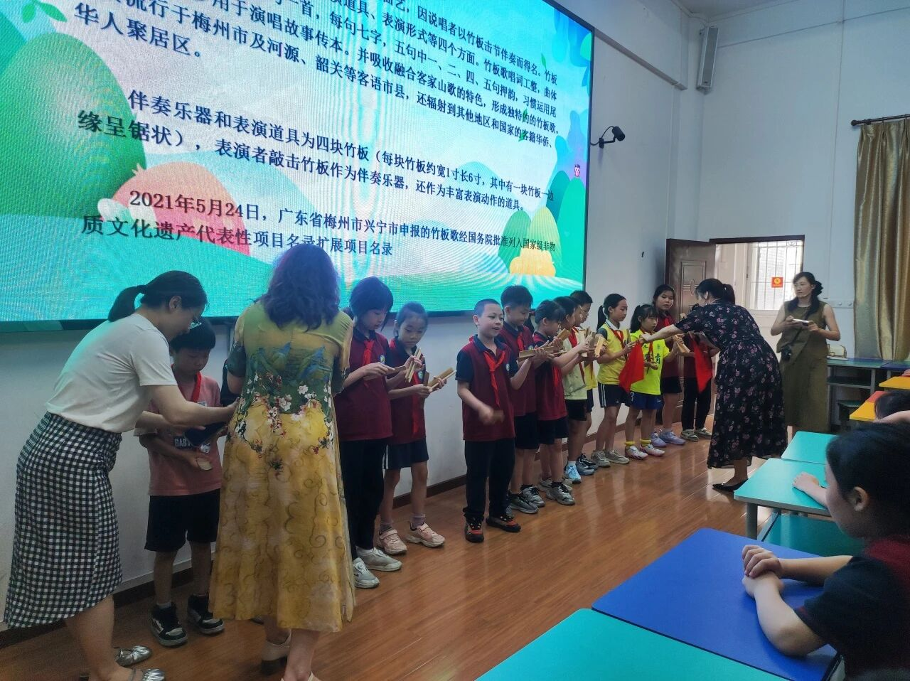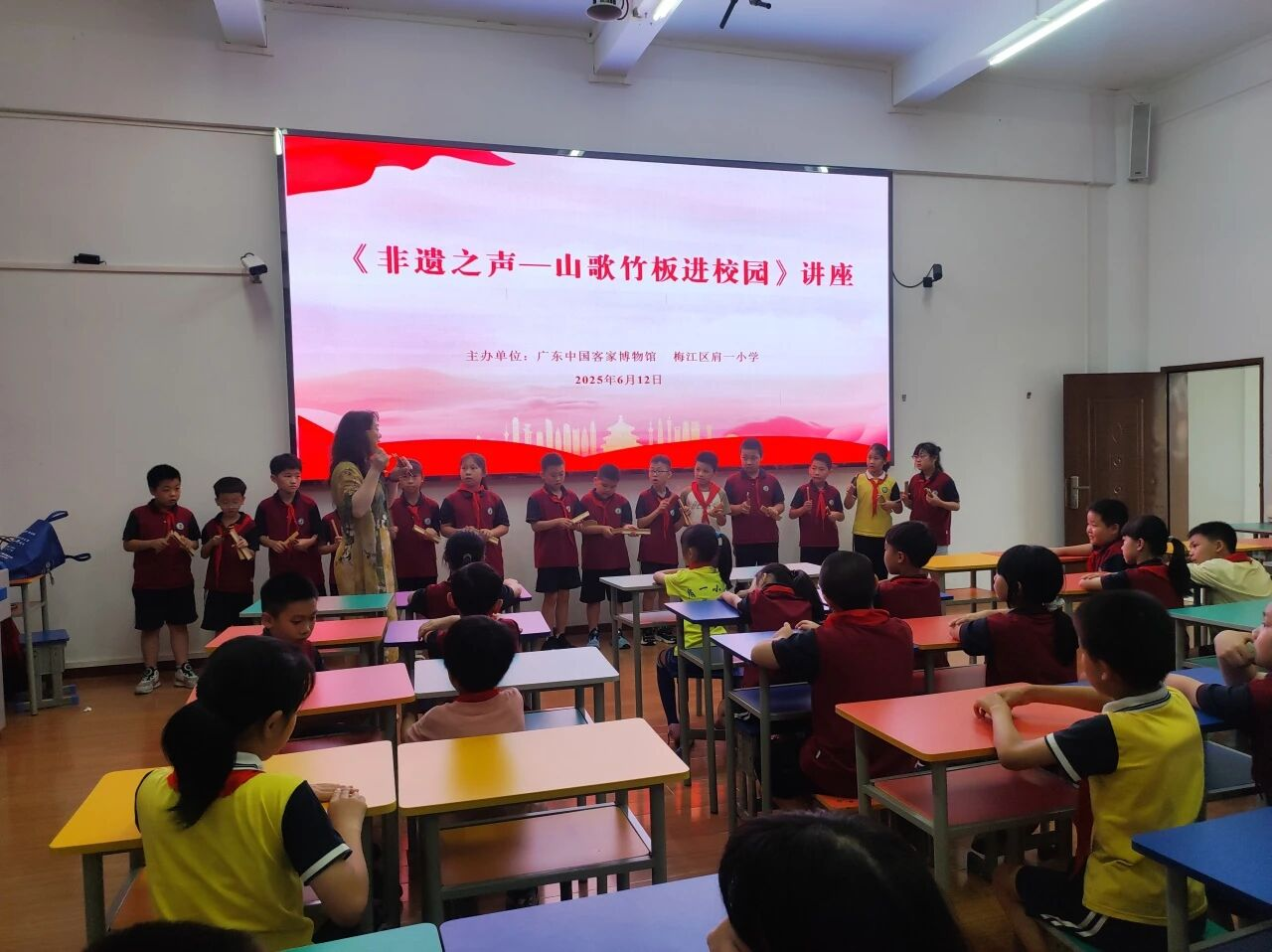 杨苑玲老师的讲座《非遗之声--山歌竹板进校园》,在肩一小学掀起“客家韵律热”。用“竹板打节奏,山歌传情意”的方式,教唱客家山歌经典曲目,没有枯燥的说教,只有生动的讲述与互动。