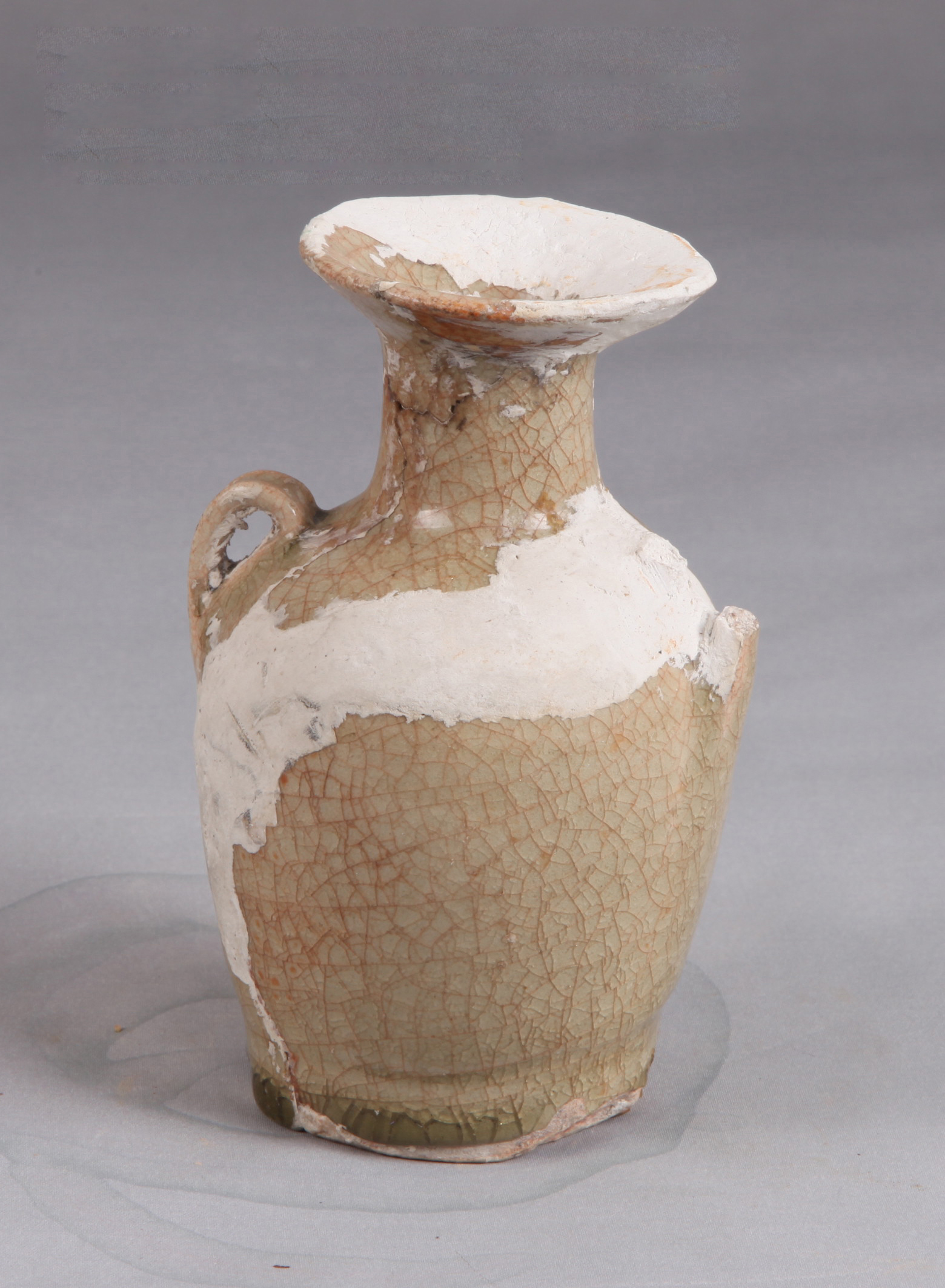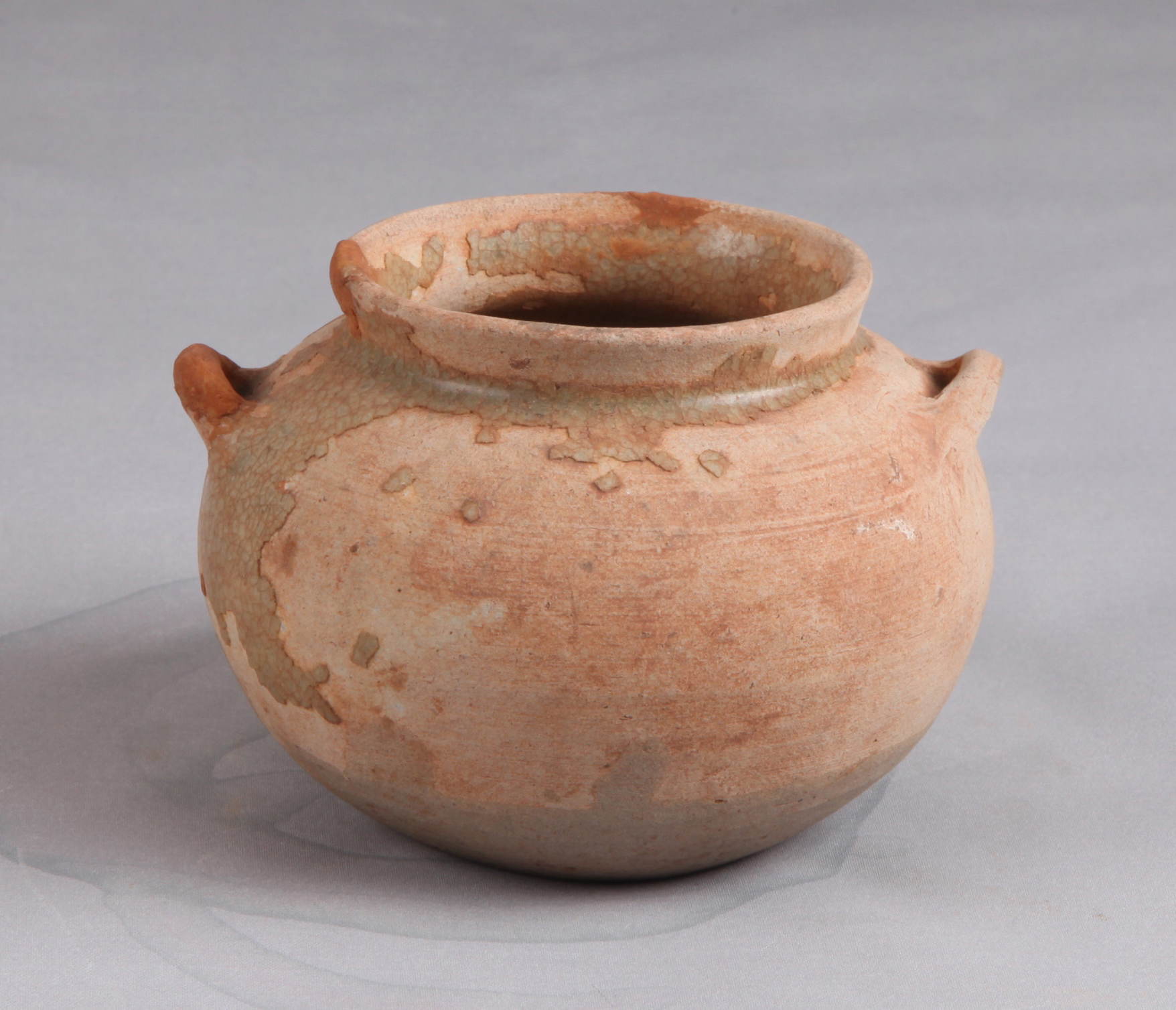 青釉不及底,开片,折沿,圆鼓腹,平底,肩饰双竖耳