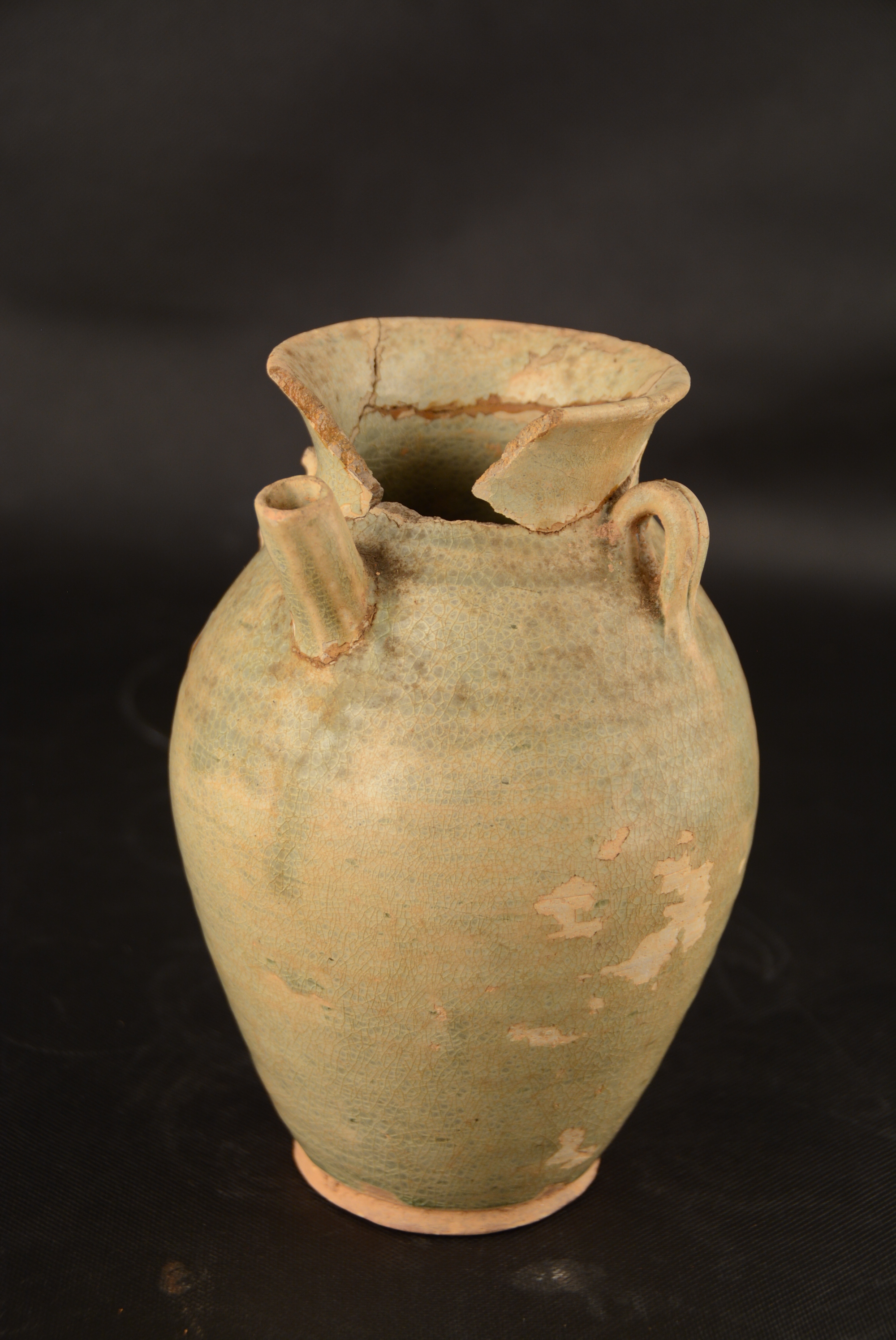 撇口,鼓腹,平底,内外施釉,三耳缺二耳,嘴残缺